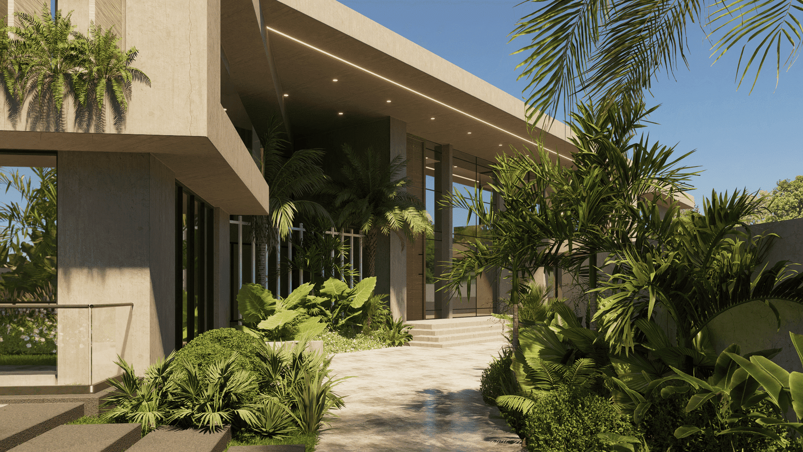 Architectural visualization of a contemporary residence surrounded by tropical planting, illustrating structure, proportion, and material intent.