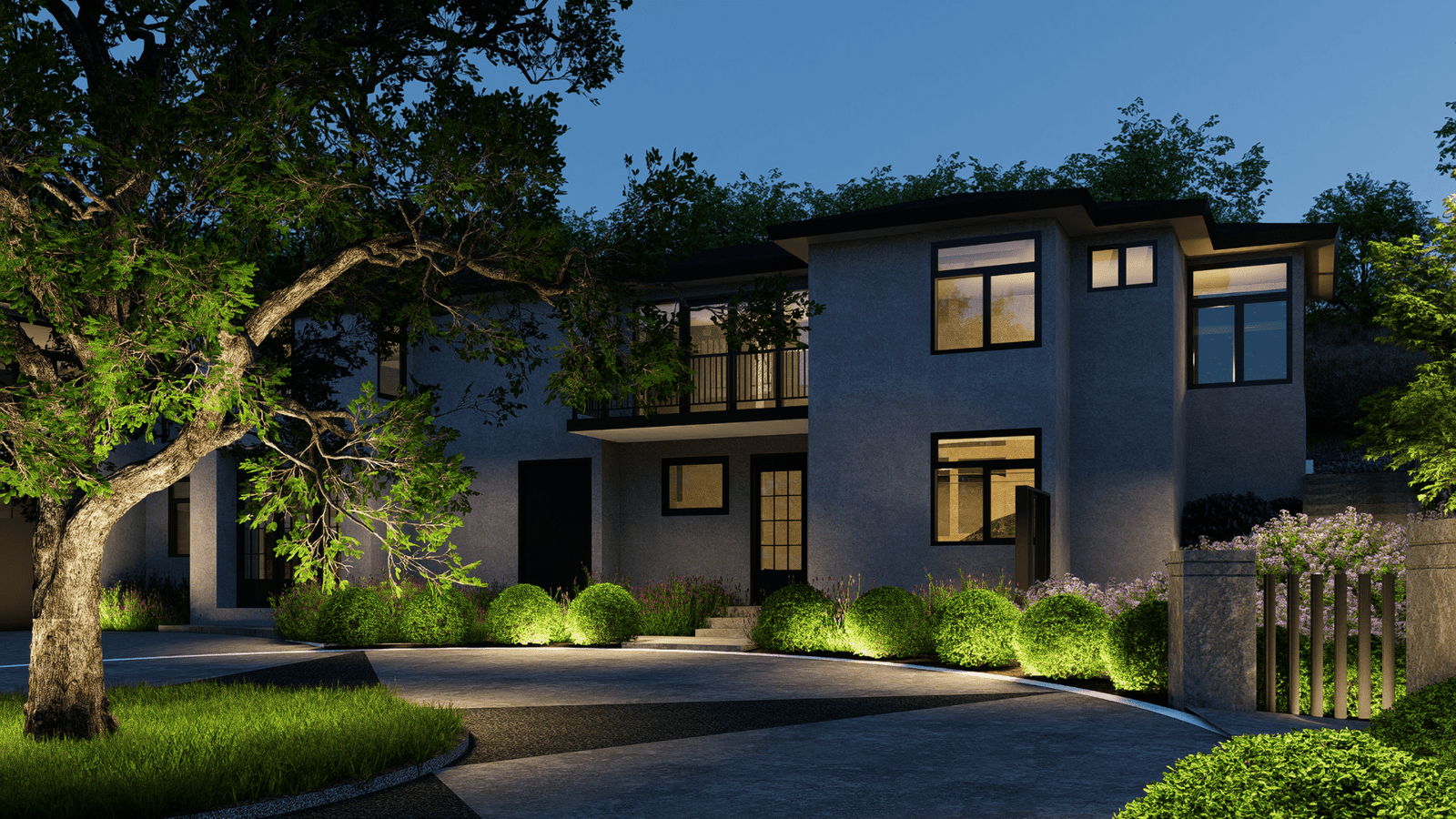 Night architectural visualization of a modern hillside residence arrival court with landscape lighting and circular drive in Foothills, California.
